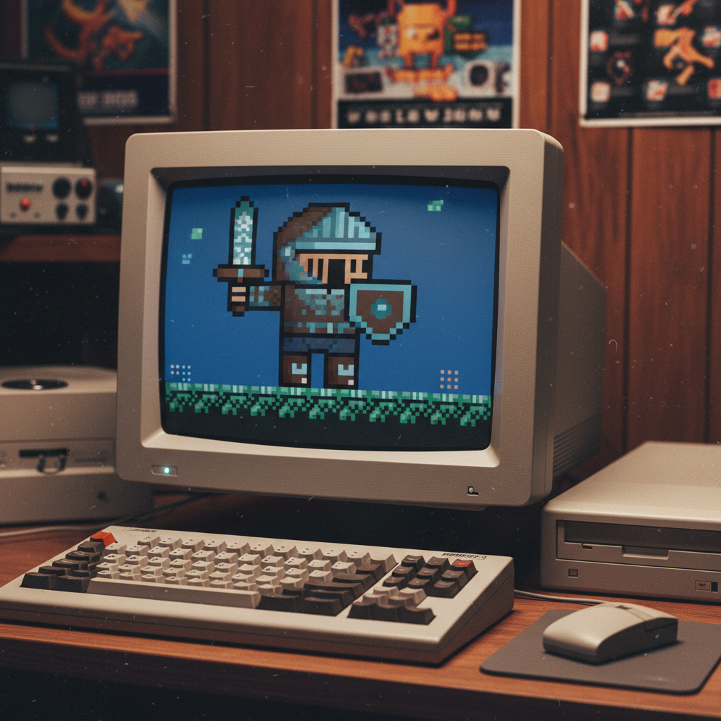 Stary komputerowy ekran z pikselową postacią, symbolizujący początki cyfrowych postaci do symulacji.