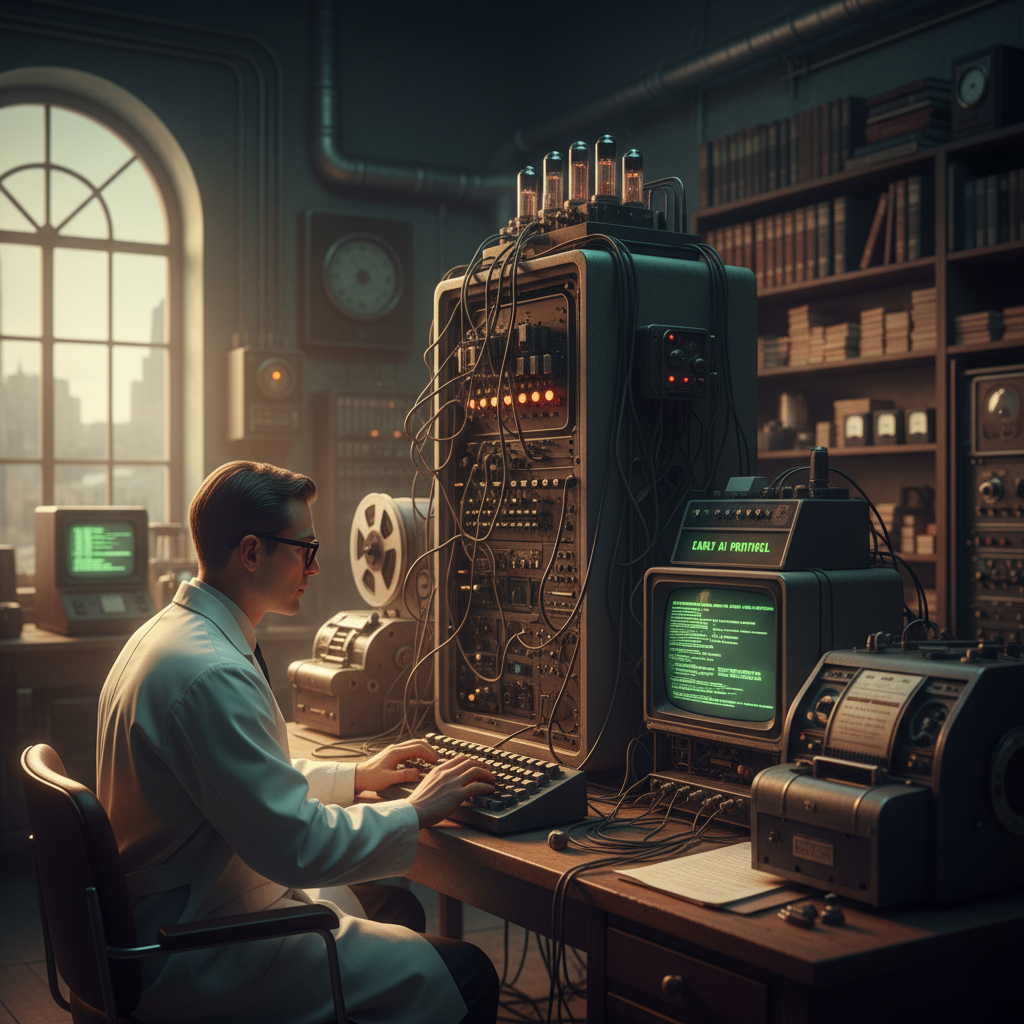 Fotografia historyczna prezentująca pierwsze laboratoria, gdzie rodziły się chatboty.