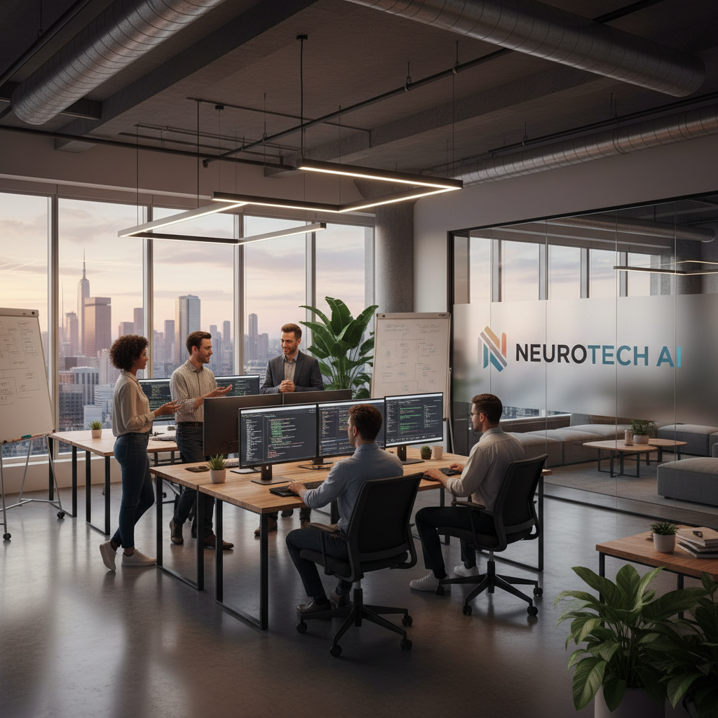 Zespół pracujący nad rozwojem chatbotów AI w nowoczesnym biurze, burza mózgów, automatyzacja komunikacji, przyszłość.