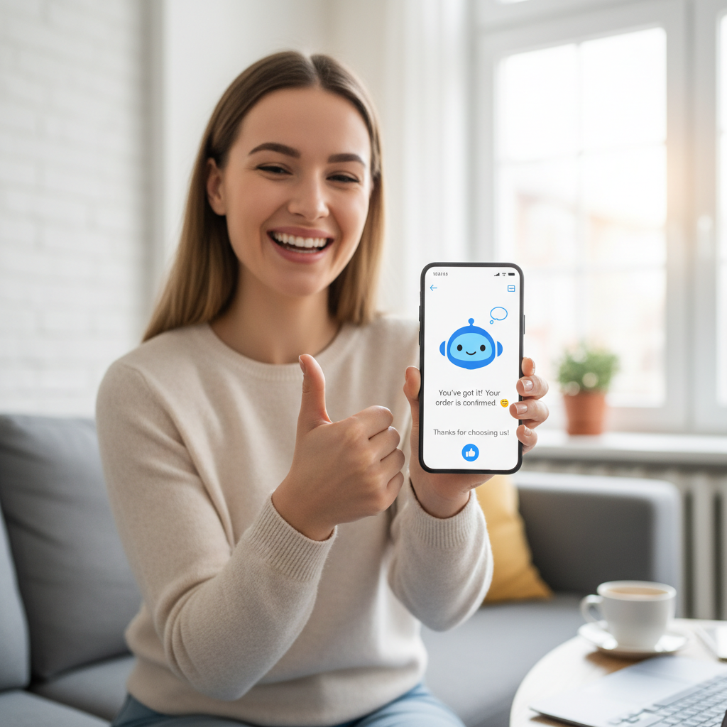Zadowolony klient rozmawiający z chatbotem e-commerce na smartfonie, personalizacja komunikacji, chatboty AI, wzrost konwersji.