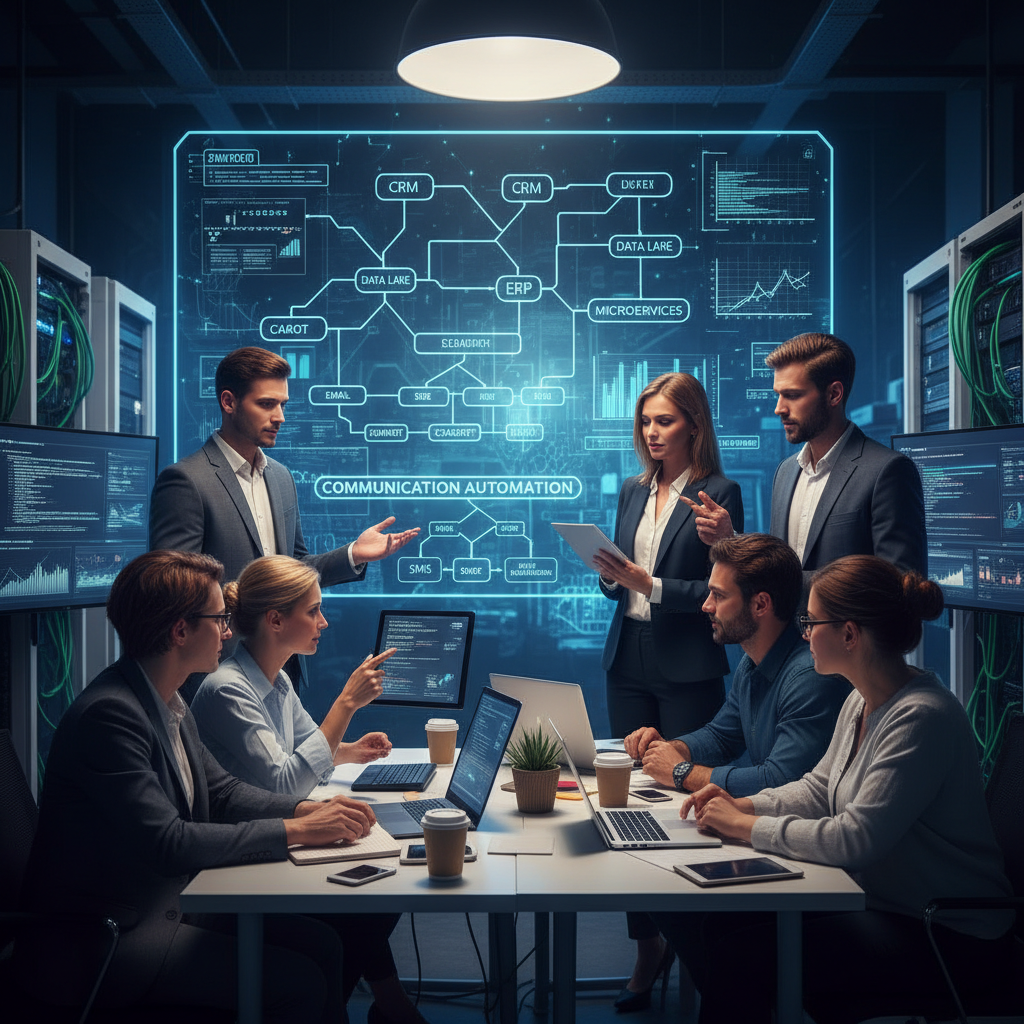 Zespół IT przy pracy nad architekturą platformy do automatyzacji komunikacji