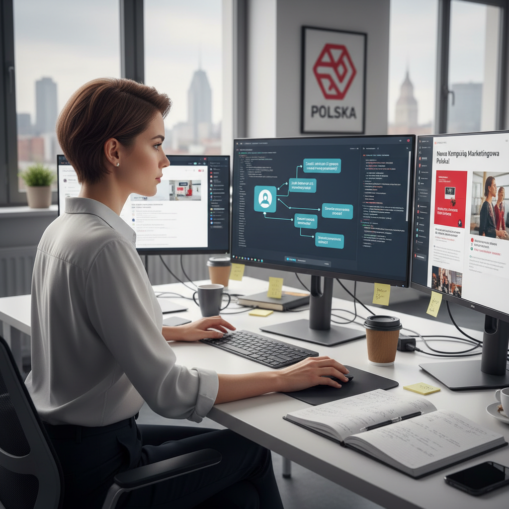 Młody marketer przy komputerze podczas wdrażania chatbota w polskiej kampanii marketingowej, w tle nowoczesne biuro.
