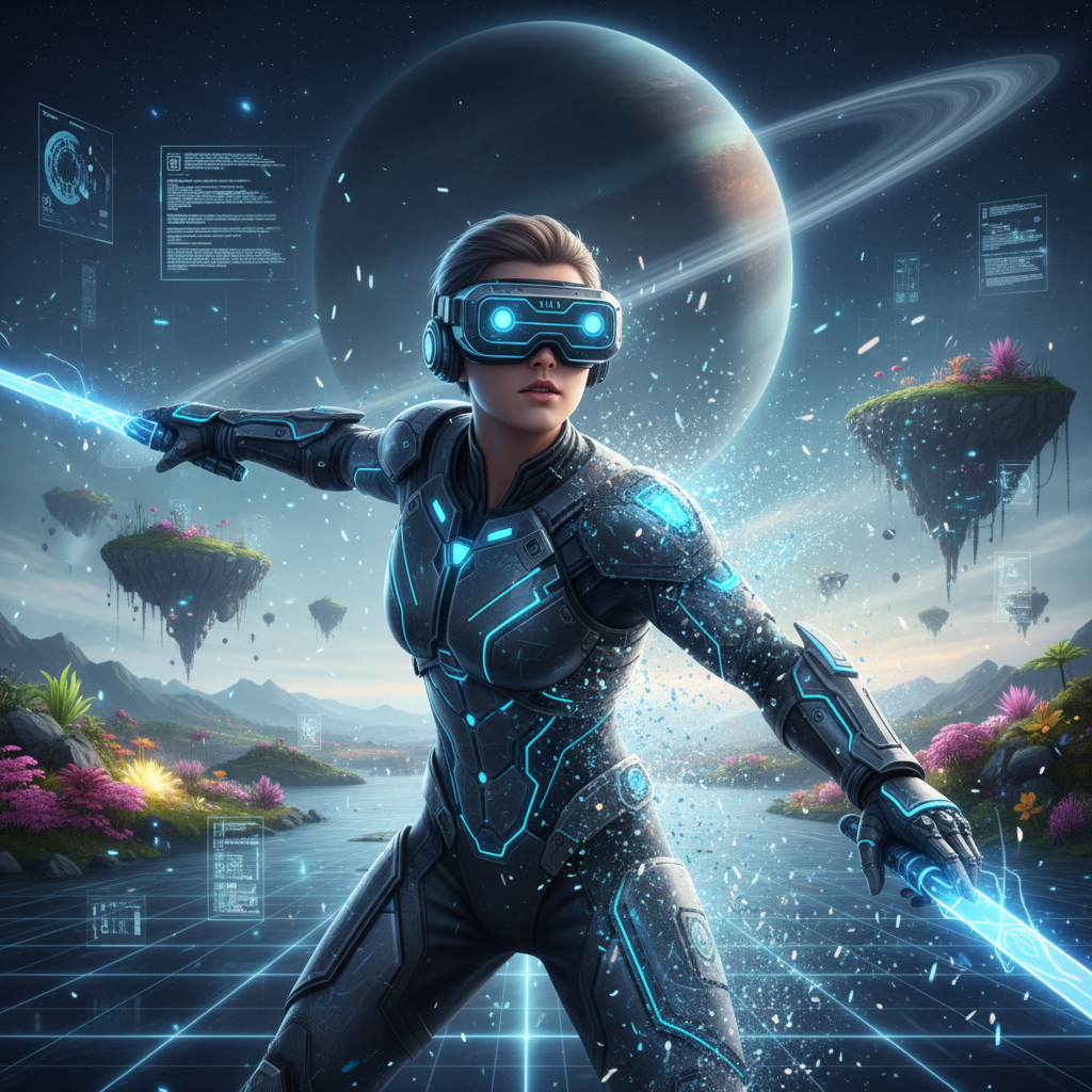Gracz korzystający z VR i hiperrealistycznego awatara, zanurzony w świecie cyfrowym